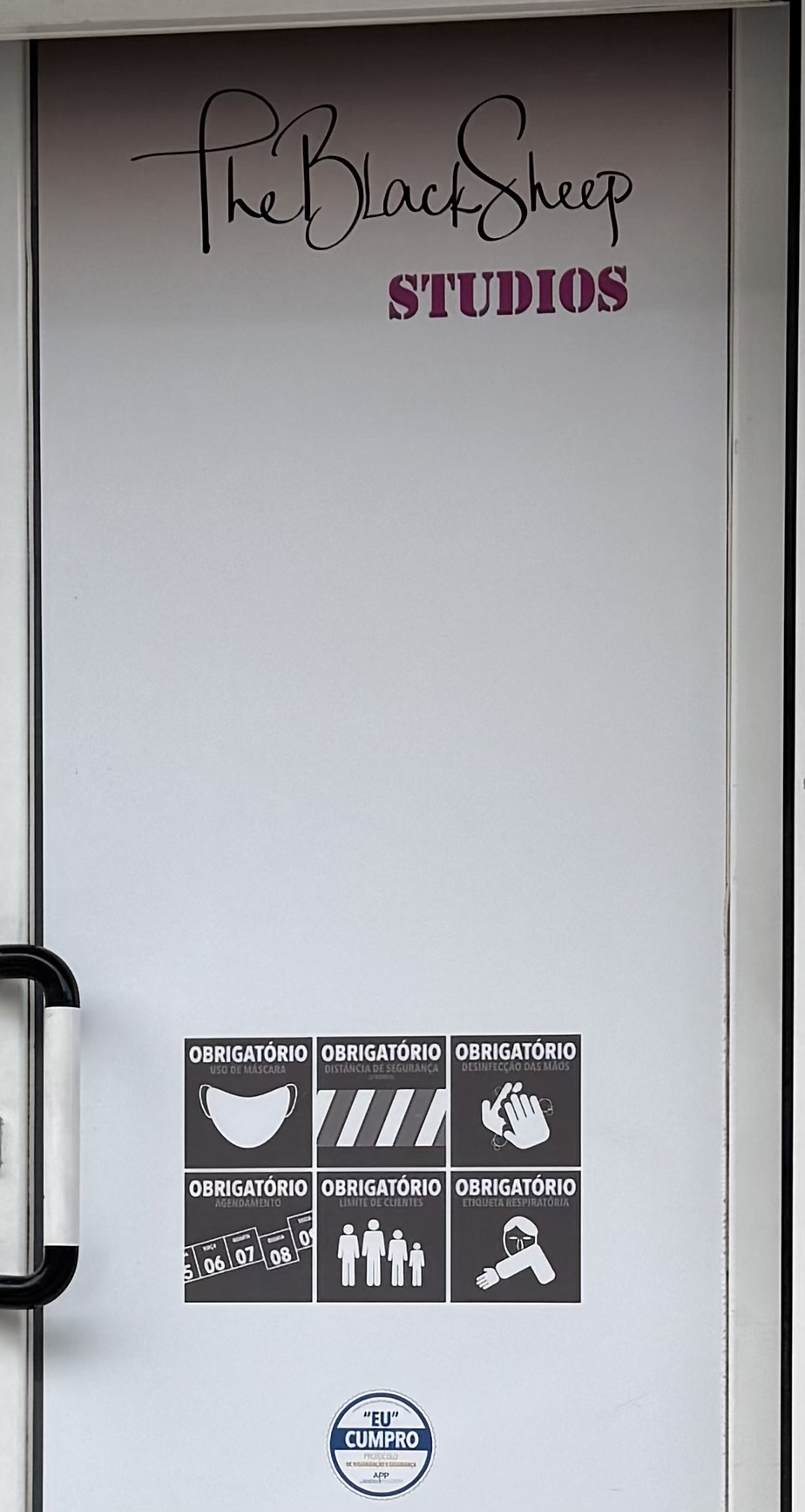 Ao ver o nome Black Sheep Studios na porta de uma loja, não foi o nome que captou a minha atenção, mas sim o autocolante colado logo abaixo, uma coleção quase burocrática de obrigações: "obrigatório o uso de máscara", "obrigatório distância de segurança", "obrigatório desinfeção das mãos", "obrigatório agendamento", "obrigatório limite de...